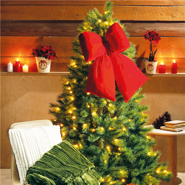 Ein besonderes Highlight setzt die rote XL-Schleife, die dem Baum einen nostalgischen Akzent verleiht und an Weihnachten vergangener Tage erinnert. Ein festlich leuchtender Weihnachtsbaum ist der Mittelpunkt jeder Dekoration. Aus hochwertigem PVC wirkt er naturgetreu, während warme LED-Lichter eine stimmungsvolle Atmosphäre schaffen. Timer- und Dimmerfunktion erlauben variierendes Licht von dezent bis festlich strahlend. Kuschelige Decken und Kissen in den sanften Trendfarben von "SANTA’S LIST" bringen Retro-Charme. Zusammen mit Kerzen, Kränzen und Pflanzen entsteht ein Ambiente, das modern und verspielt zugleich wirkt.